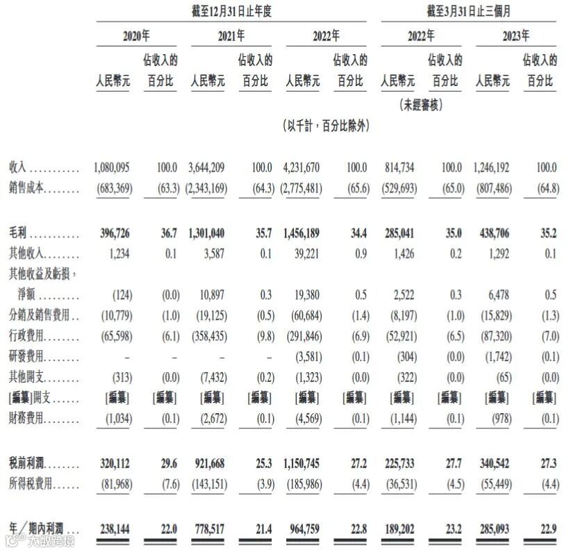 近三年来,茶百道的营收均保持增长。招股书显示,2020-2022年,茶百道营收分别为10.80亿元、36.44亿元、42.32亿元,净利润分别为2.38亿元、7.79亿元、9.65亿元。2023年第一季度,茶百道营收为12.46亿元,上年同期为8.15亿元;净利润为2.85亿元,上年同期为1.89亿元。