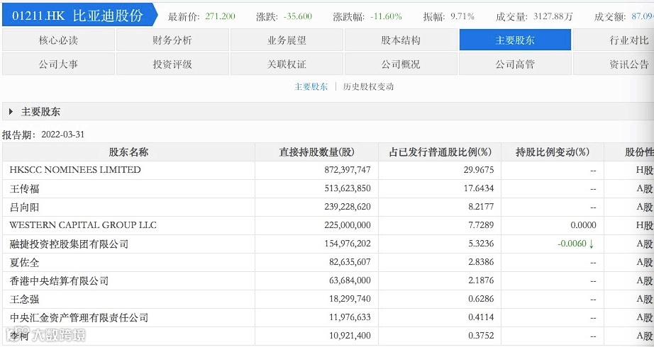 根据比亚迪最新披露的股东信息,截至今年3月31日,伯克希尔100%控股的WESTERN CAPITAL GROUP LLC(西部资本集团有限公司)仍然为比亚迪第四大股东,持股数为2.25亿股,持股比例为7.73%。