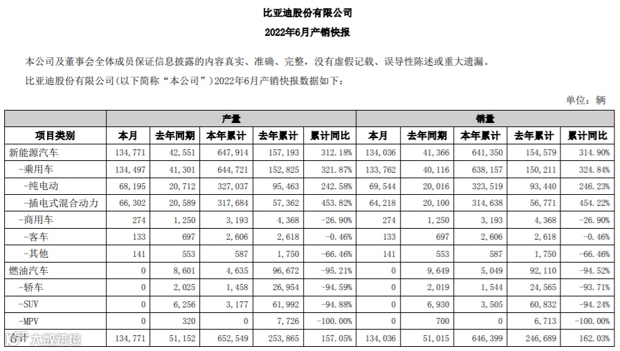 比亚迪2022年6月产销快报