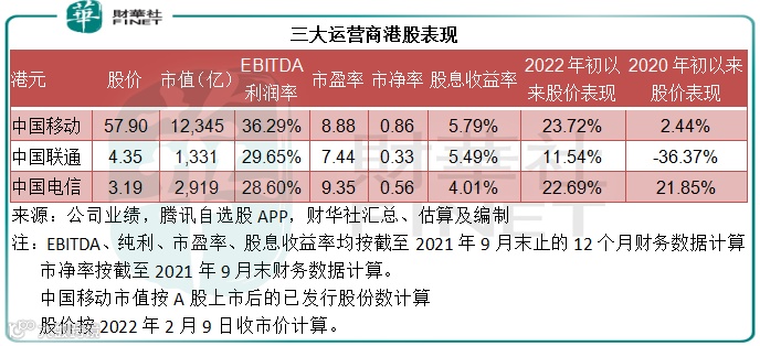 此外,2021年的整体表现也优于前三季。2021年前三季,中移动的营业收入同比增幅为12.92%,高于全年预期收入增幅,但扣非归母净利润增幅仅为3.57%,低于全年业绩指引的5%-7%,或意味着第4季的盈利表现较前三季有改善。