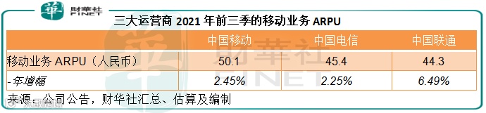 由于5G套餐的收费更高,这将有利于进一步提升中移动的每月每用户价值(ARPU),而当前中移动的移动业务ARPU是三大运营商的最高,2021年前三季为50.1元(单位人民币,下同),高于中电信的45.4元和联通的44.3元,见下表。