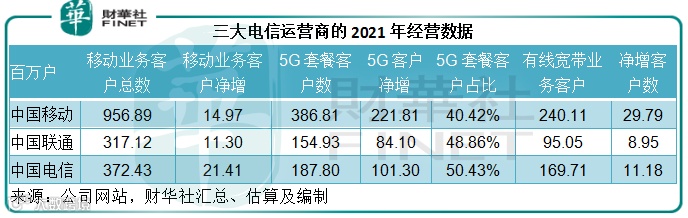 汇总三大电信运营商的2021年经营数据可得:中移动在移动业务市场仍占据难以逾越的优势,移动业务客户总数达到9.57亿,是中国电信全年3.72亿的2.57倍,是中国联通(香港)(00762.HK)约3.17亿的3倍。