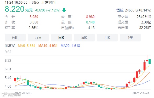 受此影响,近期新东方在线股价大涨,仅22日一天就涨了23%。11月以来,新东方在线股价累计涨幅已近一倍。不过在11月24日,新东方在线报收8.22港元,下跌了7.12%,总市值82.26亿港元。