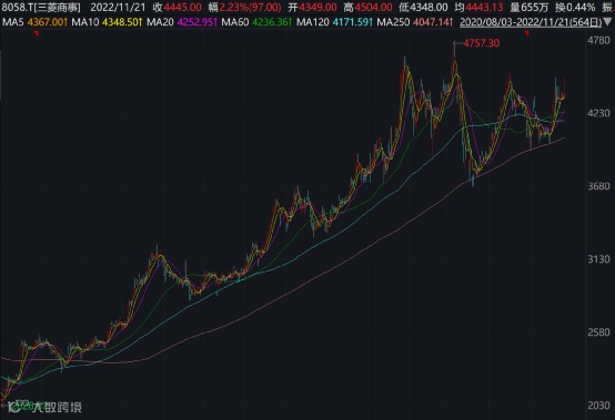 从业绩表现来看,近期住友商事将全年净利润预期上调了近一半,至5500亿日元(约合37亿美元);丸红社将利润预期上调至历史最高水平;伊藤忠商事第二财季利润超过分析师预期;三井物产此前也预期,本财年净利润将攀升至创纪录的9800亿日元。