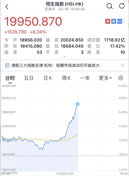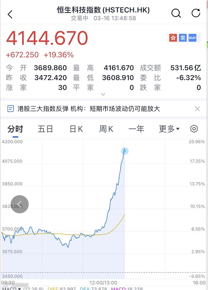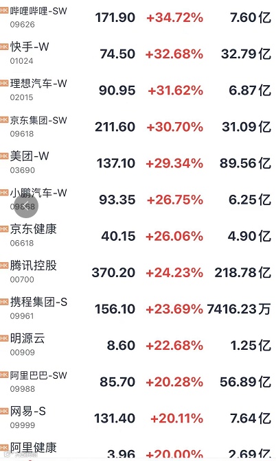 国务院金融委的消息出来之后,资本市场迅速响应,纷纷直线拉涨!恒生科技指数涨幅扩大至20%,为该指数推出以来盘中最大单日涨幅。腾讯控股、阿里巴巴均涨超20%,美团、京东集团、快手均涨超28%。