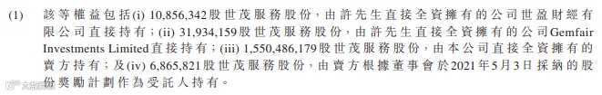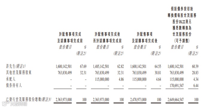公告指出,完成配售后,并假设债券悉数换股,承配人及债券持有人的持股比例分别为4.34%及6.44%。大股东世茂集团持股比例将由65.88%摊薄至58.78%,仍拥有世茂服务的控制股。至于世茂集团及集团主席许荣茂的持股比例,则由67.69%降至60.39%。是次配股、发债后,其股东架构将变化如下: