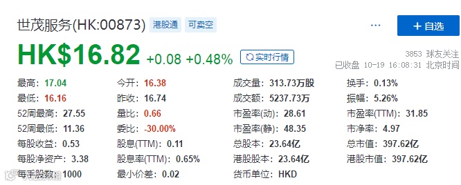 世茂服务(00873.HK),于2020年10月30日在港交所挂牌上市。截至昨日(10月19日),其收报16.82港元,其总市值为397.62亿港元。在49家香港上市的内地物业管理上市公司中,其市值排在第6位。