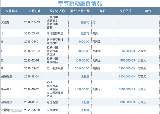 关于融资与股权架构,CVSource投中数据显示,字节跳动自2012年成立以来一共完成了10轮融资,累计金额超70亿美元,基本是以近每年一轮的融资速度发展。2014年6月的C轮融资,投后估值为5亿美元,而到2016年12月的D轮融资,投后估值已经来到110亿美元,此后以每年翻倍的速度增长。