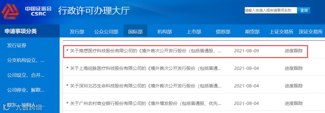 8月9日,证监会国际部披露了推想医疗的《境外首次公开发行股份(包括普通股、优先股等各类股票及股票的派生形式)审批》材料。一旦获得受理,就意味着推想医疗很快将在港交所递交招股书。