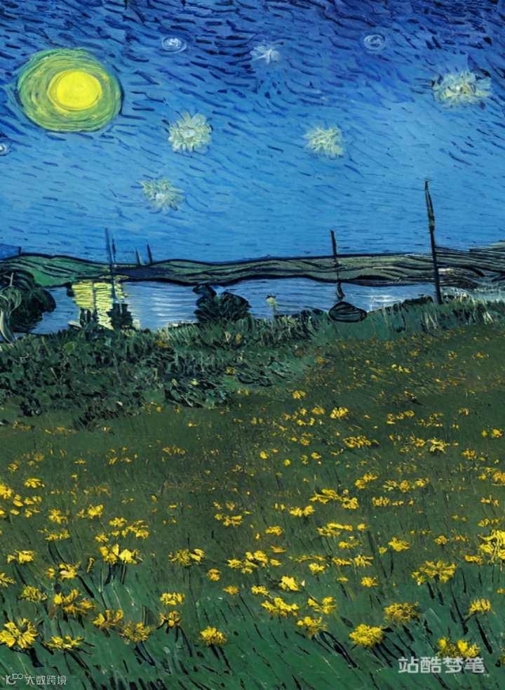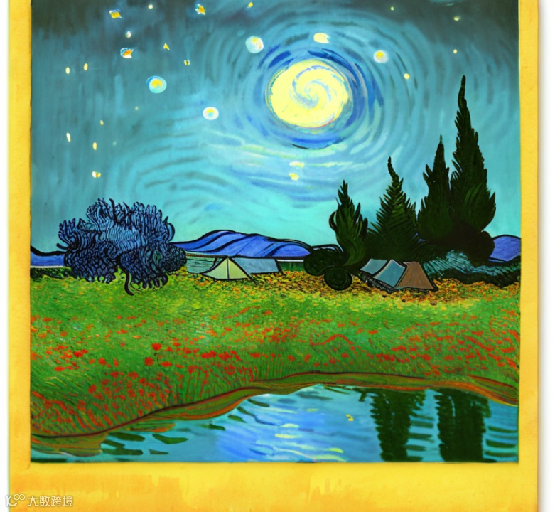 笔者以“月夜,草地,花朵,帐篷,水面倒影”为关键词,选择梵高画风,分别在“文心一格”软件和“站酷zcool”软件AI生成了如下画作: