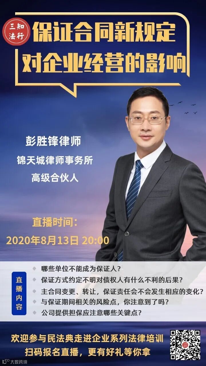 本期“民法典走进企业”系列线上讲座第五讲,将继续由彭胜锋律师为您介绍《民法典》中关于保证合同的新规定。在保证合同的订立和履行过程中,有哪些我们可能会遇到却难以辨识的“坑”?本期讲座,您将了解到以下与企业经营息息相关的保证合同的问题。
