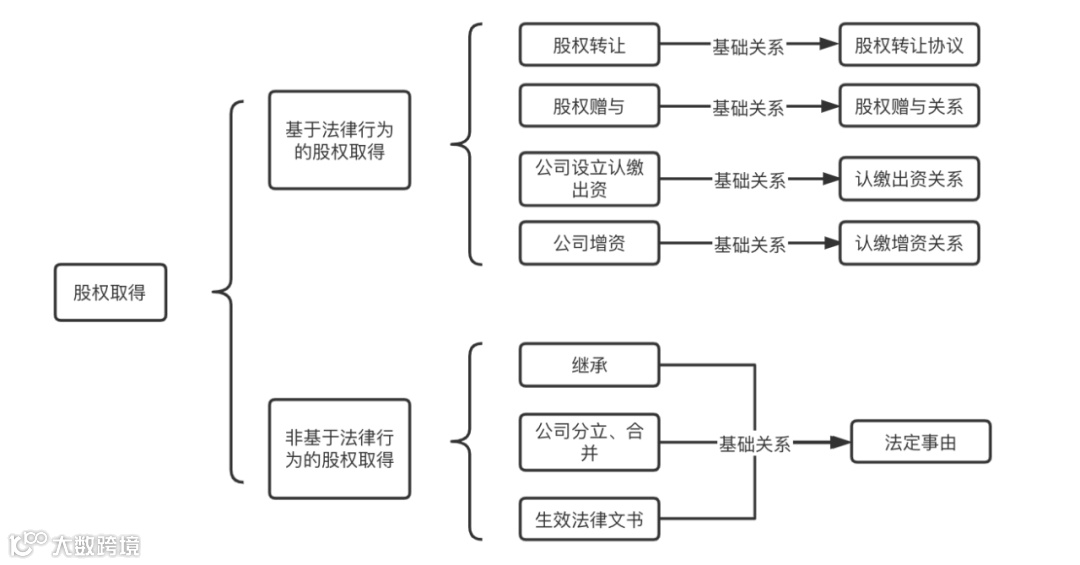 股东资格的取得方式可分为基于法律行为的股权取得和非基于法律行为的股权取得。无论以何种方式取得股东资格,均建立在一定的基础关系之上,能否取得股东资格取决于是否存在有效的基础关系。[1]