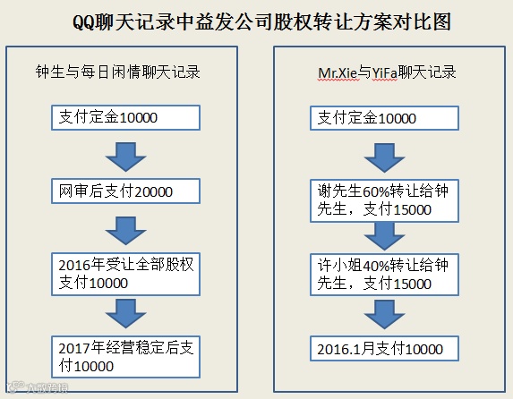 我们仔细审核对方提交的证据,发现对方提交的qq聊天记录中存在两个完全不同的股权转让方案,这进一步说明双方没有确定股权转让方案,为达成股权转让协议。但相关内容分散在几十页的证据中。为了使法官更清晰了解该事实,我方以可视化的方式予以呈现(如图)。