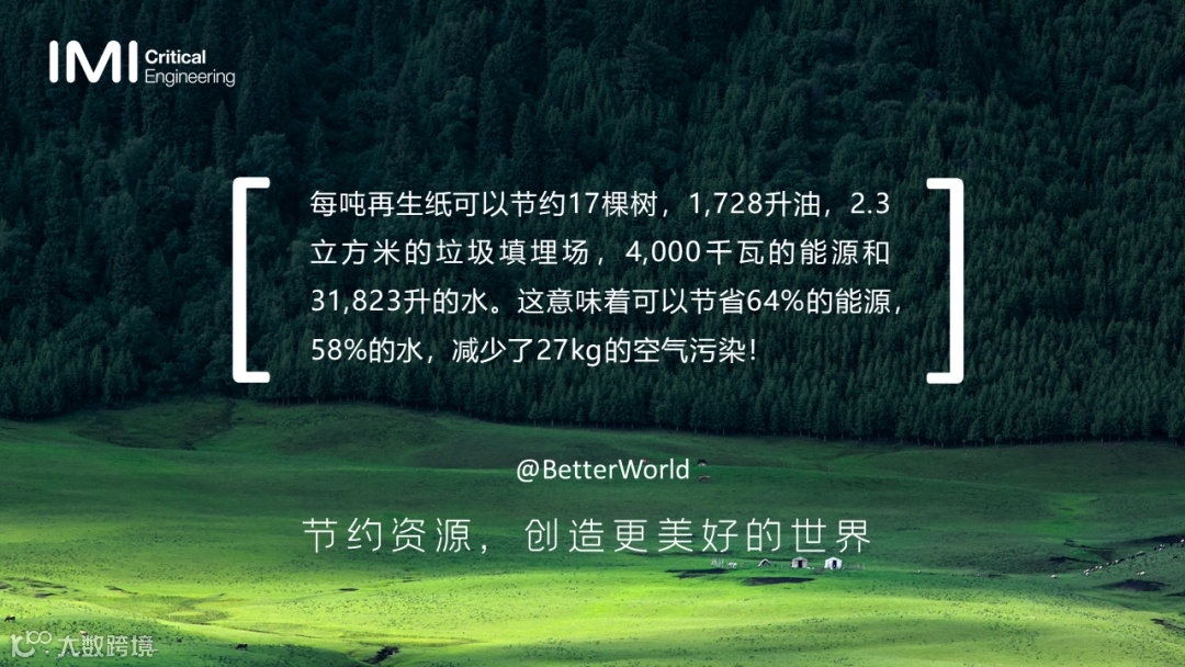 IMI在全球持续开展A Better World活动,向大家提倡绿色低碳生活,关爱身边的人,共同创造更美好的世界,体现了IMI的环保理念与强烈的社会责任感。