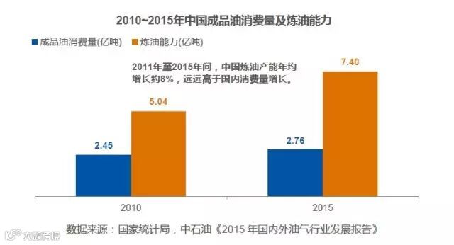 2015年,原油产量2.13亿吨,同比增长1.8%;原油加工量4.79亿吨,增长3.5%,成品油产量3.37亿吨,同比增长约6.6%,增长率下滑4.2%;石油净进口3.28亿吨,同比增长6.4%,石油对外依存度上升到60.6%。