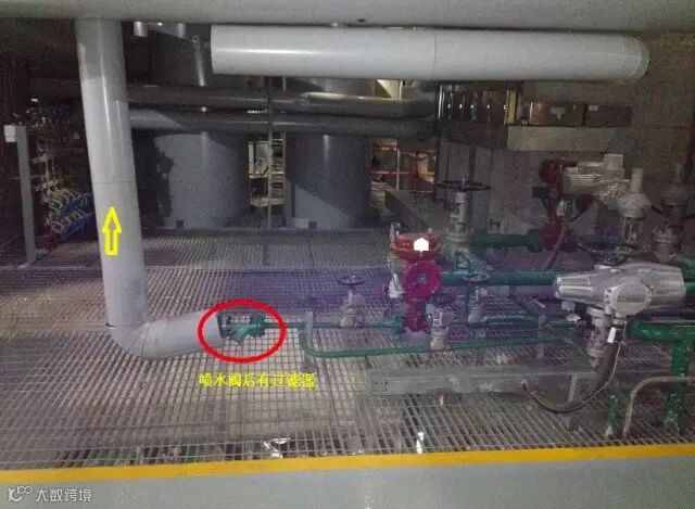 案发现场,水阀后加装了过滤器,喷水压力经过调阀减压后,再经过过滤器的压损,就不易监控实际的进入喷嘴的压力。
