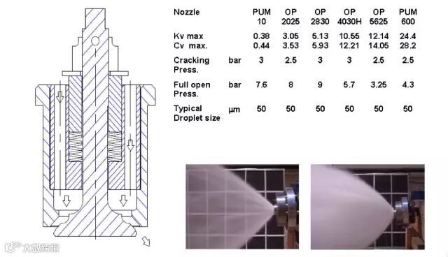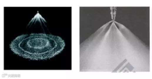 下面图示为喷水在小流量和大流量的雾化效果和各种弹簧式喷嘴的基本参数。