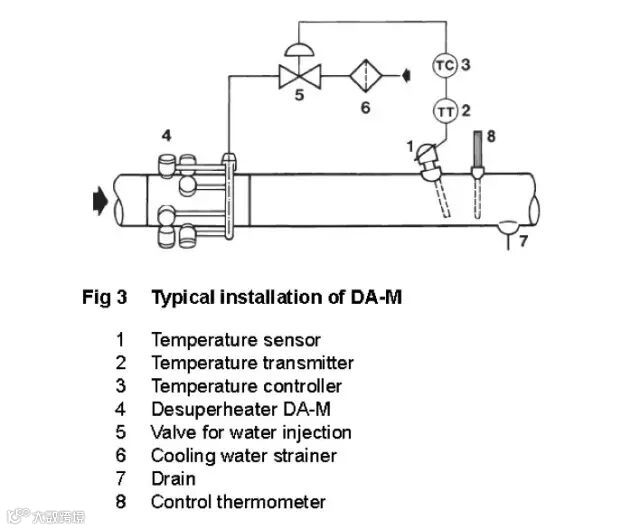 下图的减温器系统布置较好,一般减温器前蒸汽直管段为1米,减温器后混合蒸汽直管段为4-6米,测温点安装距离减温器出口为8米。减温水阀入口前装过滤器,过滤器最好装在喷水压力测点之前,更易精准控制。