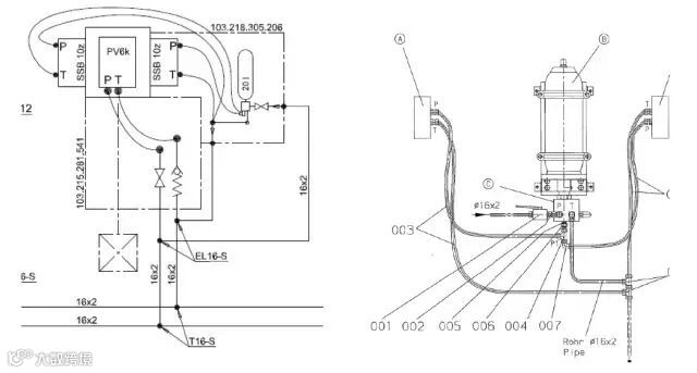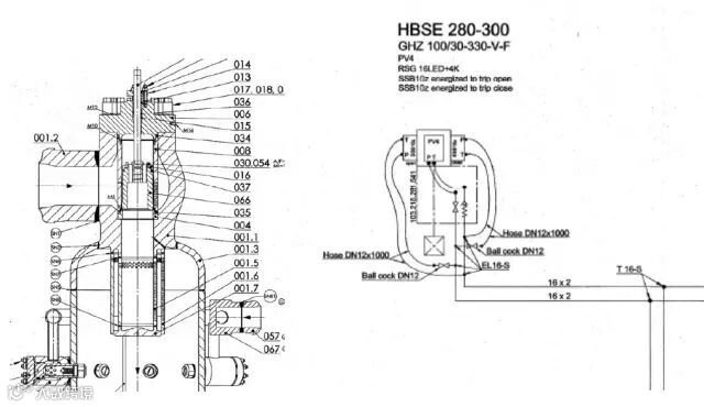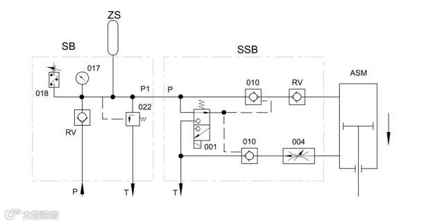 油站输出的工作油经逆止阀Rv进入就地蓄能器,平时会处于保压状态,压力约为15MPa,022为泄压阀,保护蓄能器不超压,当快关电磁阀动作,则蓄能器内的油顶开SSB模块内的两个010逆止阀,油路实现快关动作;反之就是快开,而快开和快关时间可以通过004的节流阀进行速度调整。