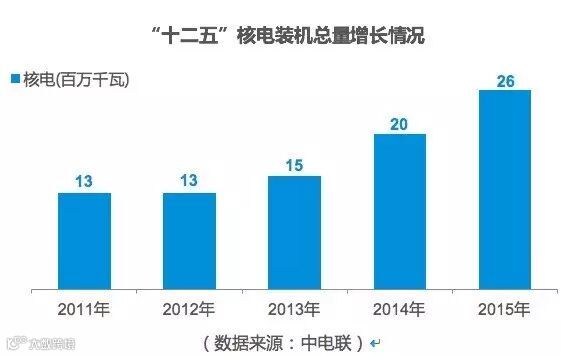 《核电中长期发展规划(2011-2020年)》及《能源发展战略行动计划(2014-2020年)》等公开文件明确,到2020年,核电装机容量5800万千瓦(58GW),在建3000万千瓦(30GW)规模,发电占比从目前的2%提升至4%。如果“十三五”目标保持不变,完成8800万千瓦(88GW)的既定目标,预计“十三五”期间平均每年至少需要开工6台机组。