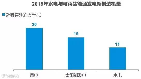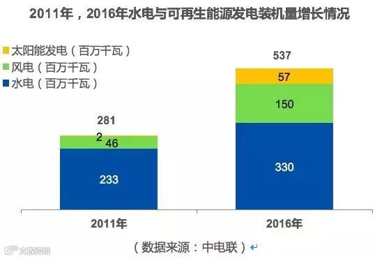 2016年末,三类清洁能源发电的总装机量预计可达到5亿3700万(537GW),占总装机量的33%,发电量却仅占总发电量的24%左右。