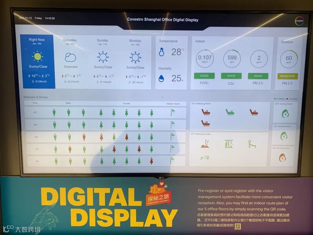 科思创认识到数字化正为整个化工和塑料行业带来众多新机遇,可以帮助科思创实现可持续发展目标。例如:办公室每个楼层入口都有一块电子显示屏,实时显示楼层空气质量,温度,湿度等数据。除此以外,各楼层健身室、盥洗室、母婴室的使用情况一目了然,将数字化应用到企业内资源管理。