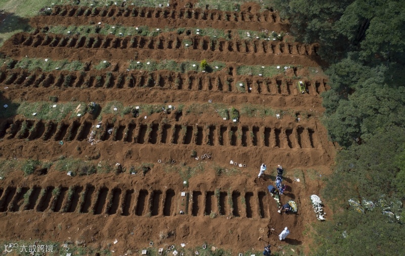 在巴西圣保罗,墓地工作人员穿防护服挖新坟,为严峻疫情作准备/美联社