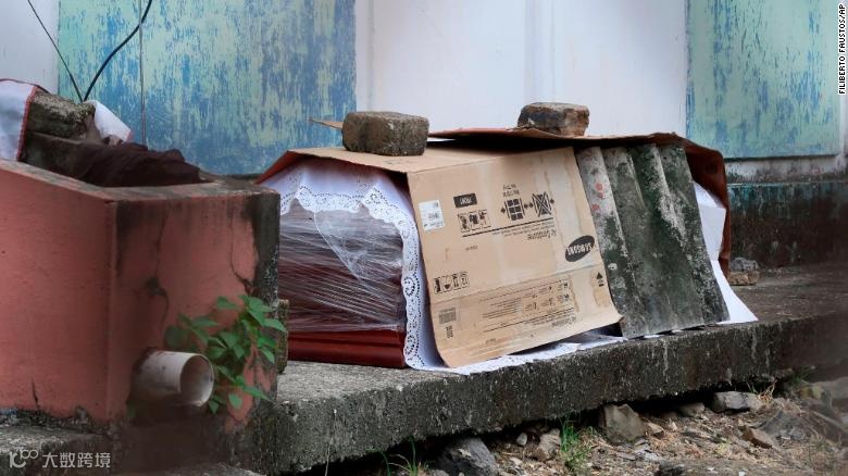 4月2日在瓜亚基尔(Guayaquil)的一处家庭公寓外,棺材里装有死于COVID-19的死者,棺材上包裹着塑料,上面覆盖着纸板/美联社