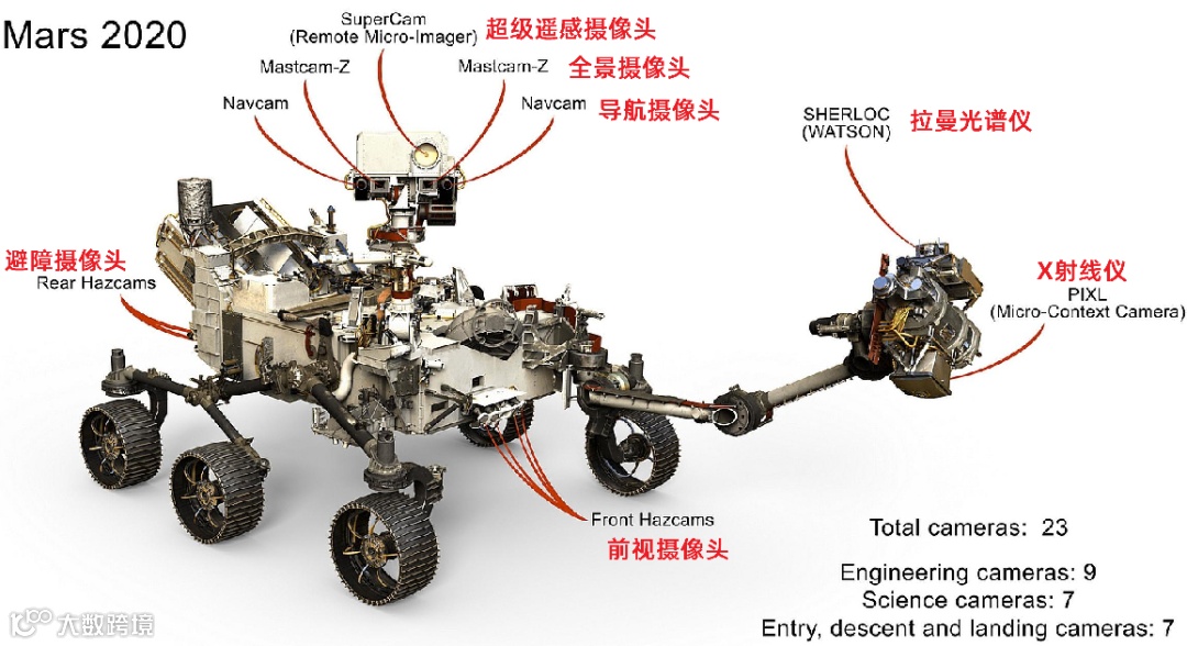 不过与汽车不同的是,“毅力”号火星车携带了7台仪器:桅杆相机、火星环境动力分析仪、火星氧元素原位资源利用实验仪、X射线岩石化学行星载荷、火星次表层雷达成像实验仪、宜居环境有机物和化学物质拉曼与冷发光扫描探测仪、超级相机。