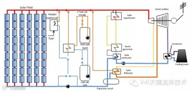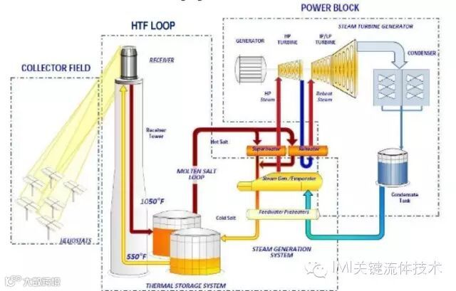 将太阳能通过反射汇聚起来加热高温熔盐(主要为氯化钾和氯化钠等),使得高温熔盐的
