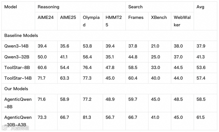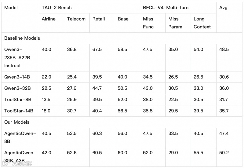 下表进一步给出了本次开源的 AgenticQwen 模型在 Agent 能力基准上的整体效果,并与原始 Qwen3 底座以及面向 Agent 场景的专用小模型 ToolStar-8B/14B 进行对比。整体结论是:在相近甚至更小的参数规模下,AgenticQwen 系列在多任务、多轮工具调用的综合指标上取得了更强的可用性,验证了“轨迹闭环训练”对 Agent 落地能力的高密度增益。