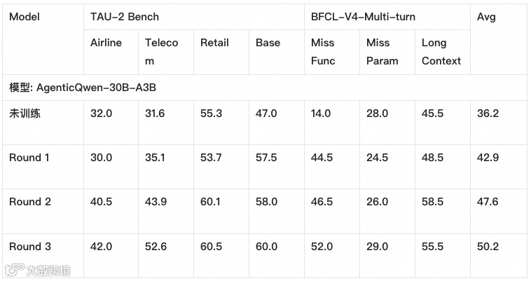 下表展示了 AgenticQwen-30B-A3B(以 Qwen3-30B-A3B 为底座)在多轮数据飞轮训练中,TAU-2 Bench 与 BFCL-V4-Multi-turn 两个 Agent 基准上的提升趋势。我们可以看到,随着轮次推进,模型不仅整体分数上升,也在如“漏工具(Miss Func)”“漏参数(Miss Param)”“长上下文(Long Context)”等更贴近真实落地痛点的子项上获得改进,体现出飞轮对“复杂流程鲁棒性”的持续强化。