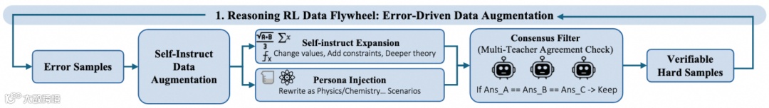 推理飞轮面向数学/科学类任务,每轮训练后收集模型做错的样本作为 hard samples,并进行三步扩增: