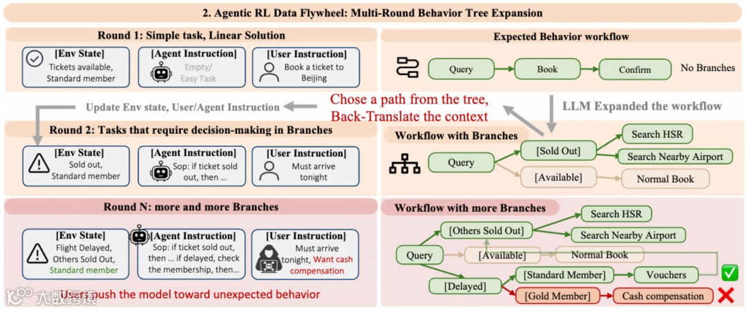 每轮RL之后,使用教师模型在原流程中注入条件分支:基于不同环境状态,生成替代子路径,把线性链路扩展成行为树(behavior tree)。比如把“有票(Available)”替换为“售罄(Sold out)”,原来的“预订→确认”就会扩展出新分支:改搜高铁、查询邻近机场、改签到其他日期等。这样任务从“只有一条正确路径”升级为一个需要根据状态选择分支的 MDP:同一个用户目标,在不同状态下必须走不同策略。