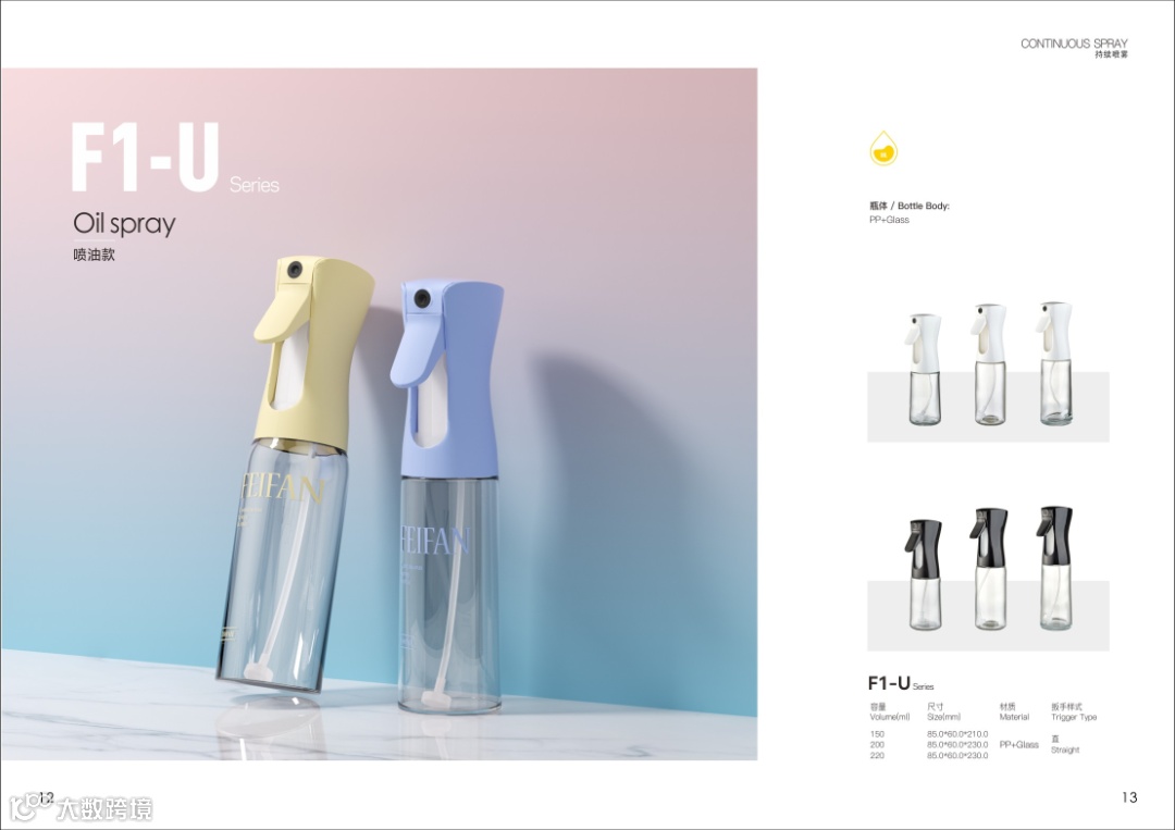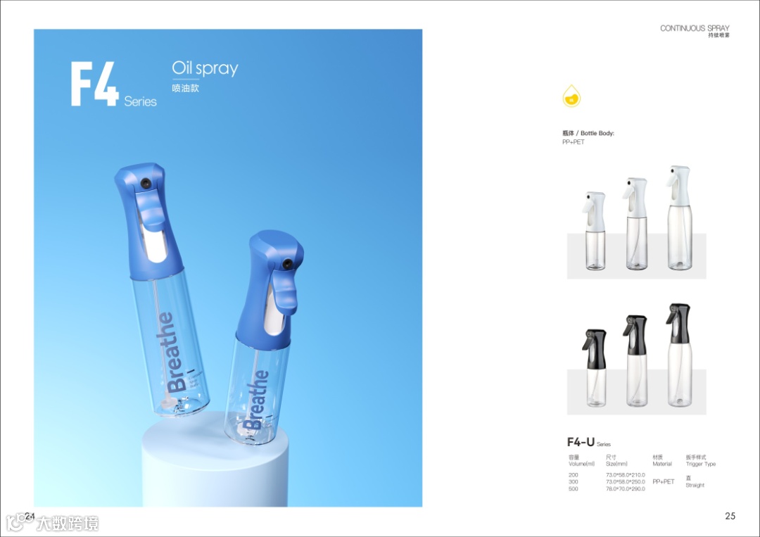 持续喷雾泵,喷雾器,真空瓶,PETG高端化妆瓶以及喷油壶,按压油壶等厨卫产品。成立至今,工厂不断引进人才,目前拥有一支技术精湛,经验丰富的研发团队,长期致力于领先产品的自主研发/也可根据客户需求定制各类包。