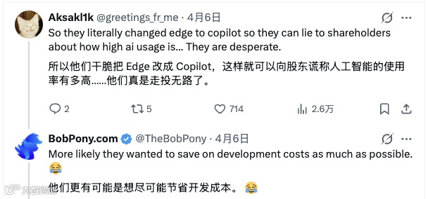 由此也有人质疑:“他们干脆把 Edge 改成 Copilot,这样就可以向股东谎称人工智能的使用率有多高……他们真是走投无路了。”
