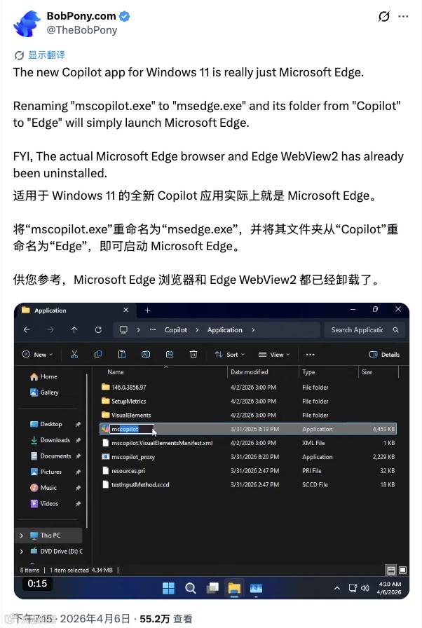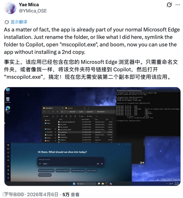 另一位网友 Yae Mica 也指出,反过来操作也可行:“事实上,这个应用(Copilot)本身已经是你正常安装的 Microsoft Edge 的一部分。你只需要重命名文件夹,或者像我做的那样,把文件夹做一个符号链接到 Copilot,然后打开‘mscopilot.exe’,就能直接使用这个应用,而无需安装第二份副本。”