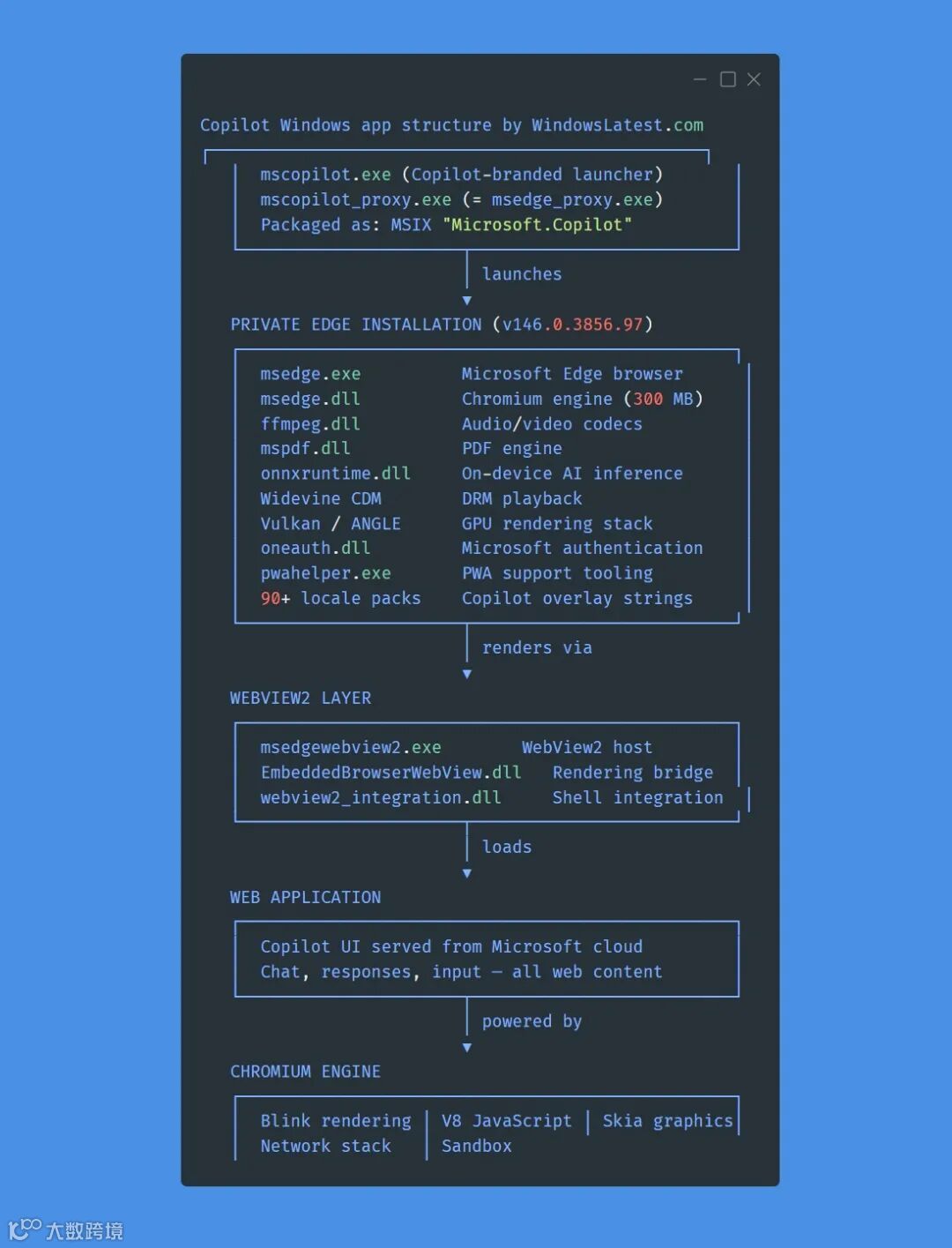 对此,外媒 Windows Latest 对 Copilot 安装包进行了拆解分析,给出了更细致的答案。在其看来,新版 Copilot 并非单纯“套壳”Edge,但确实内嵌了一整套完整的 Edge 浏览器。