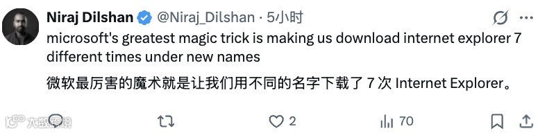 有网友调侃道:“微软最厉害的魔术就是让我们用不同的名字下载了 7 次 Internet Explorer。”