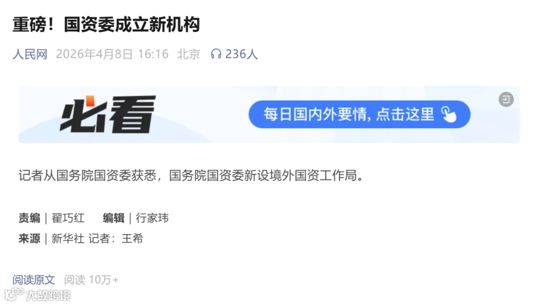 4月8日,人民网发布一则简短却分量十足的消息:国务院国资委新设境外国资工作局。