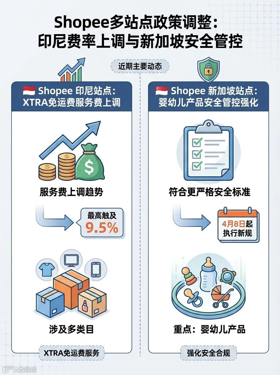 Shopee近期在多个站点调整费用与规则。Shopee印尼站多类目XTRA免运费服务费上调,最高触及9.5%。同时,Shopee新加坡站点强化婴幼儿产品安全管控,4月8日起执行新规,要求相关产品符合更严格的安全标准。