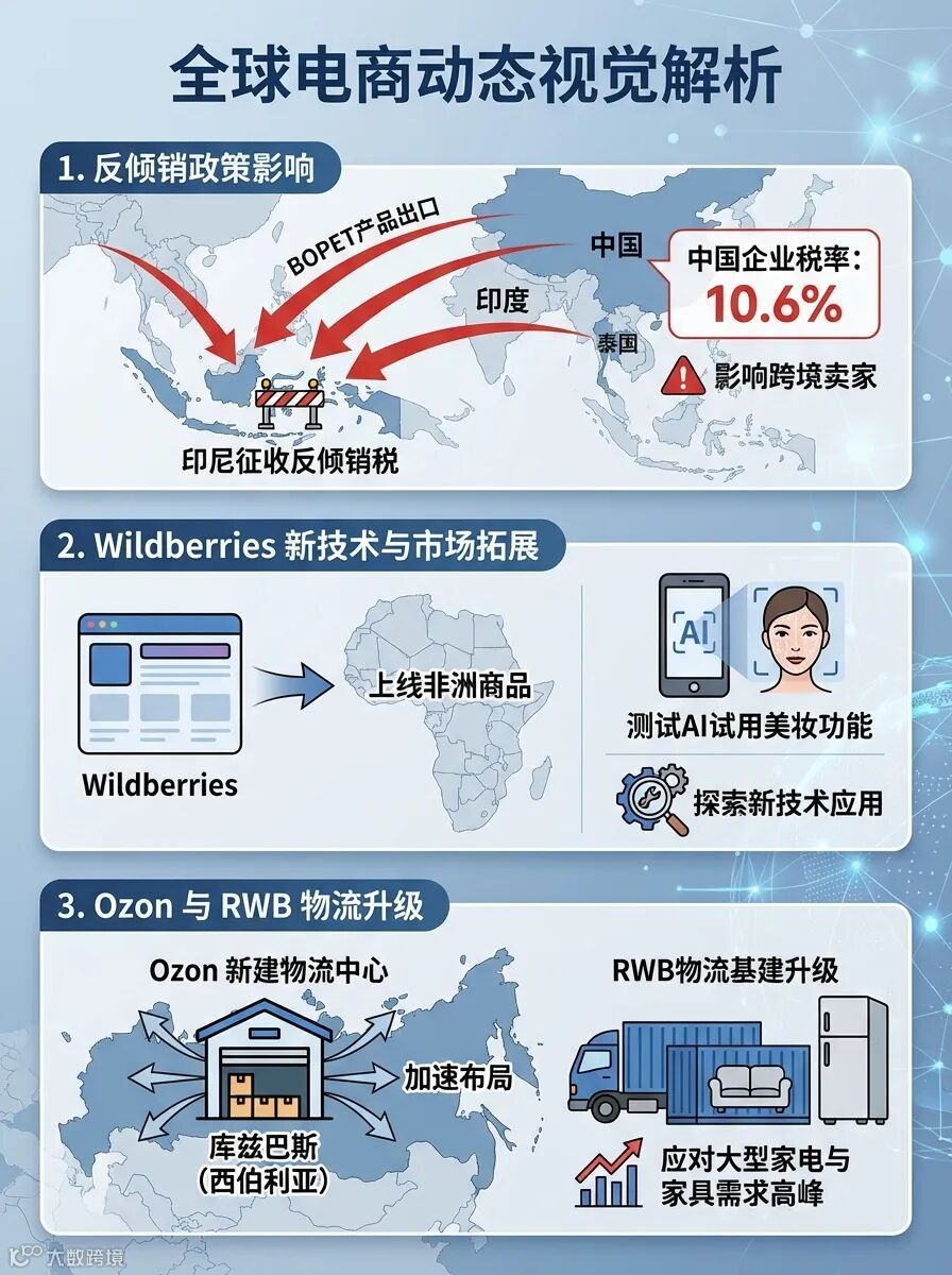 印尼对中印泰三国BOPET产品征收反倾销税,中国多数企业税率为10.6%,影响相关跨境卖家。Wildberries即将上线非洲商品,测试AI试用美妆功能,探索新技术应用。Ozon在库兹巴斯新建大型物流中心,加速西伯利亚布局,RWB物流基建升级助力卖家应对大型家电与家具需求高峰。