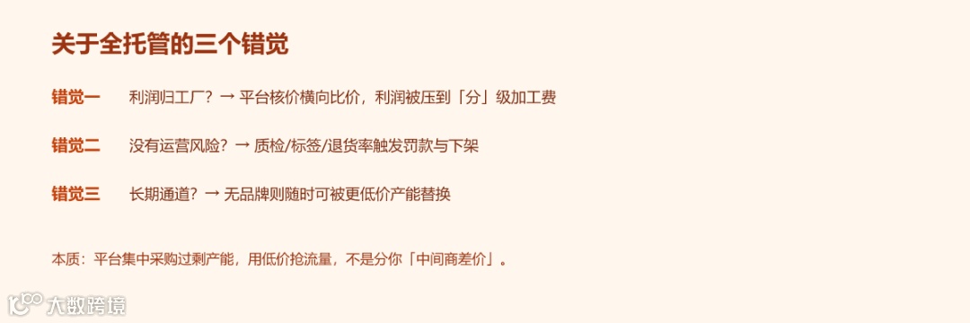 在算法和比价机制下,工厂之间所有的工艺改良和微创新,都被粗暴地拉平为“成本优势”。你今天因为降价一毛钱拿到了单子,明天就会因为别人降两毛钱而出局。这是一场没有尽头的底线竞次(Race to the bottom)。 - 把全托管当“清库存”的下水道,而不是主阵地