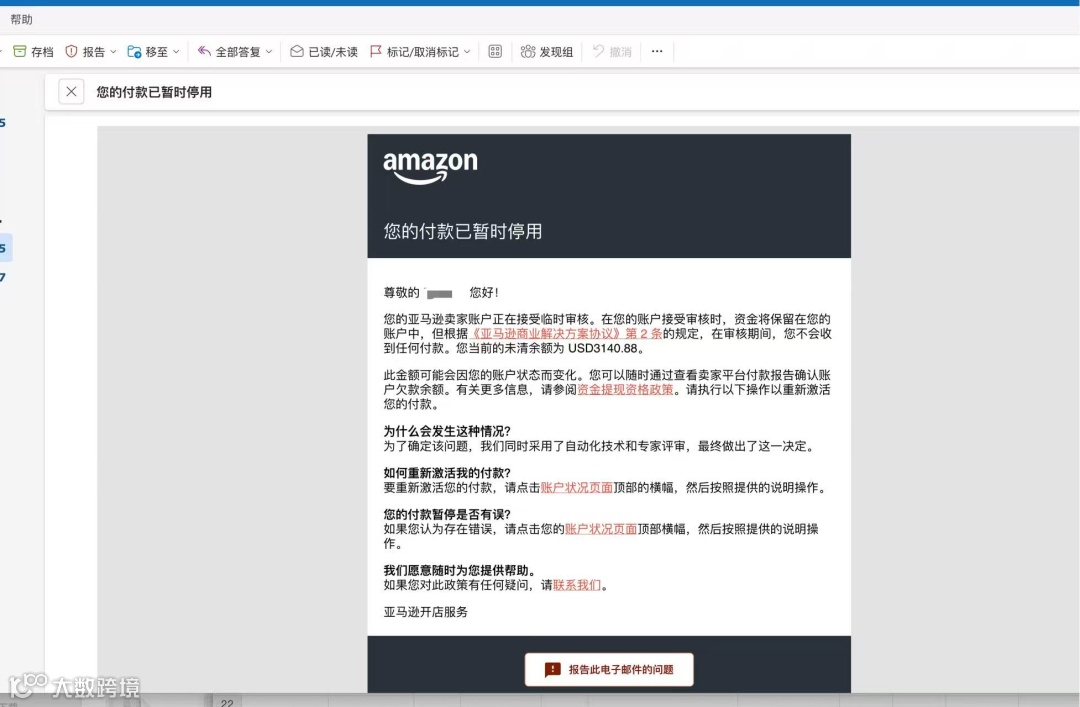 亚马逊冻结付款:为防止损失扩大,亚马逊暂停资金流出,要求你先解决账户安全问题。