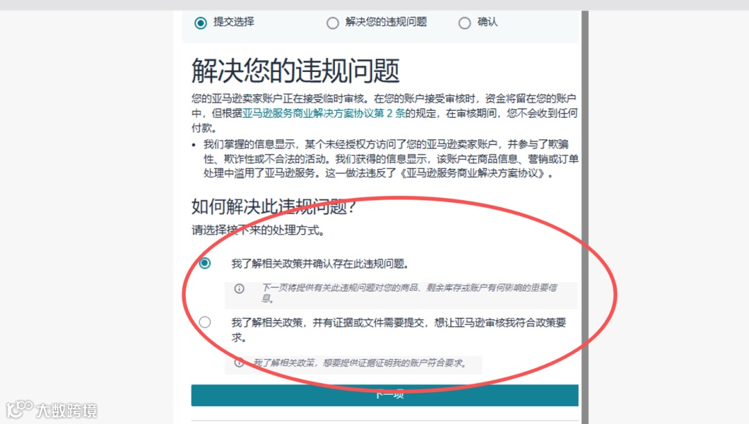 → 选择这个意味着你承认账户存在滥用行为(无论是否你本人操作),后续整改要求极高,且可能导致永久记录。“我了解相关政策,并有证据或文件需要提交,想让亚马逊审核我符合政策要求”