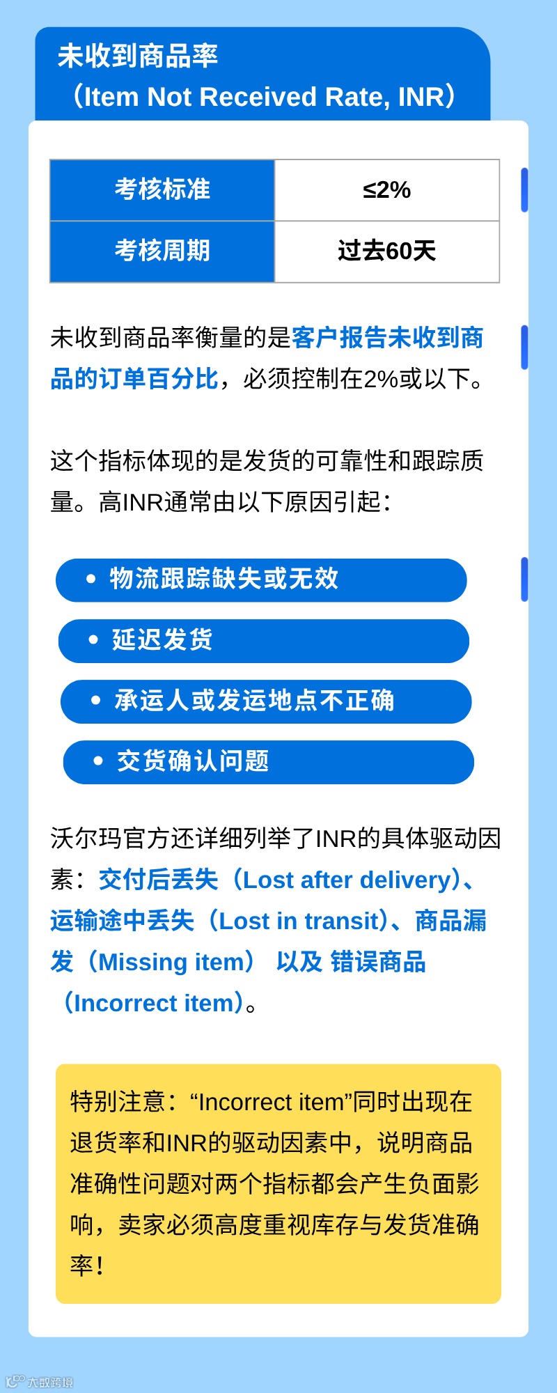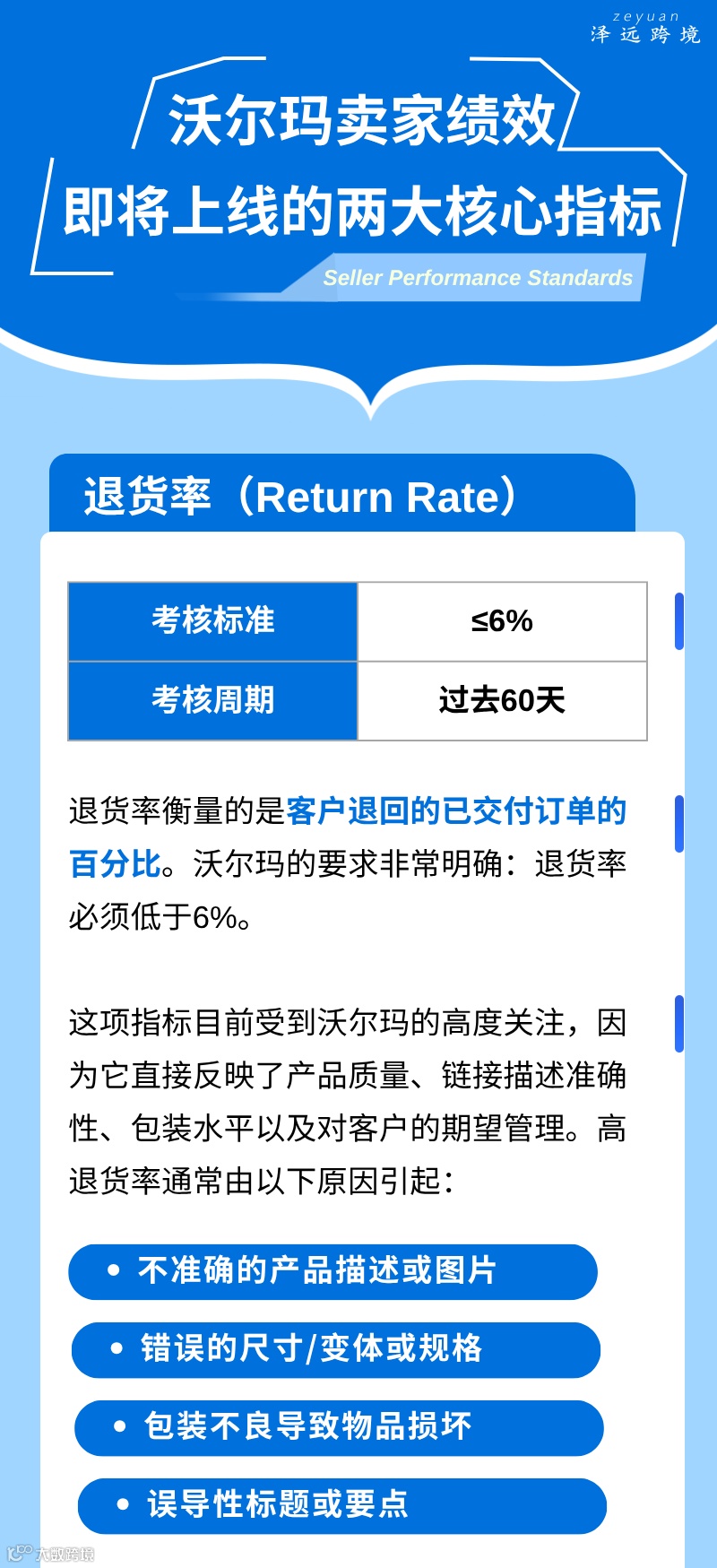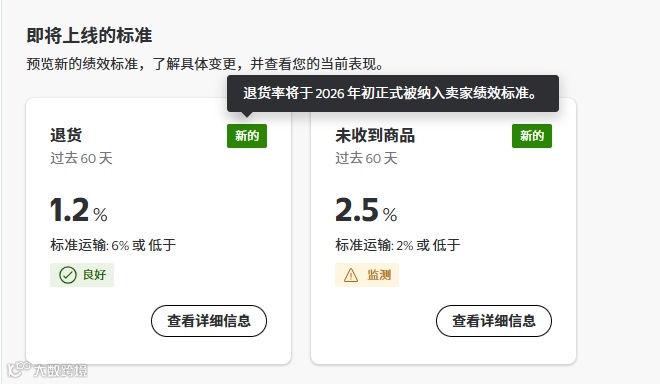 沃尔玛卖家绩效标准的监测周期已更新为30天(部分指标如退货率、INR按60天滚动计算)。