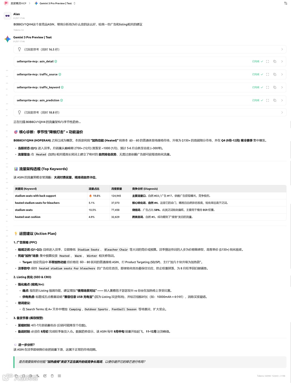 没有MCP:打开卖家精灵,查看各种数据,然后自己记录分析数据,最后才得出结果。