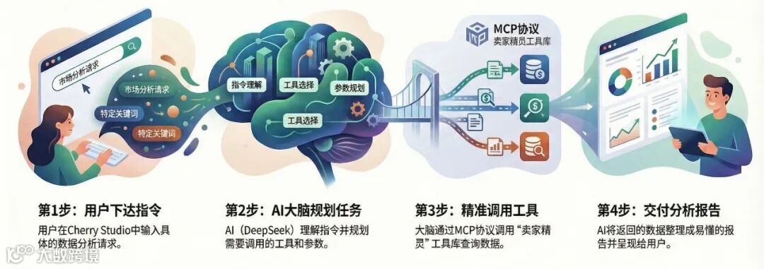 如果把ChatGPT、Deepseek当成一个与世隔绝的“大脑”,那么卖家精灵MCP就是给这个大脑打开与外界信息连接的通道。