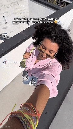 就拿这则短视频广告来说,素材时长9秒左右,属于真人穿戴测评类型,博主在街边、泳池展示穿搭效果,五彩斑斓的手链十分亮眼,看到视频中的画面,用户也可以联想到自己佩戴产品的效果,对购买产品跃跃欲试。