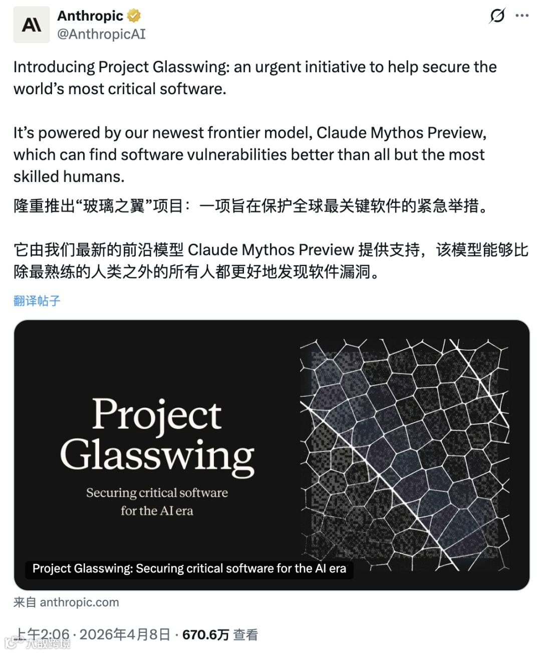 鉴于模型能力强大,Anthropic暂不对公众开放,仅限40余家关键基础设施组织研究使用,并提供1亿美元使用补贴。